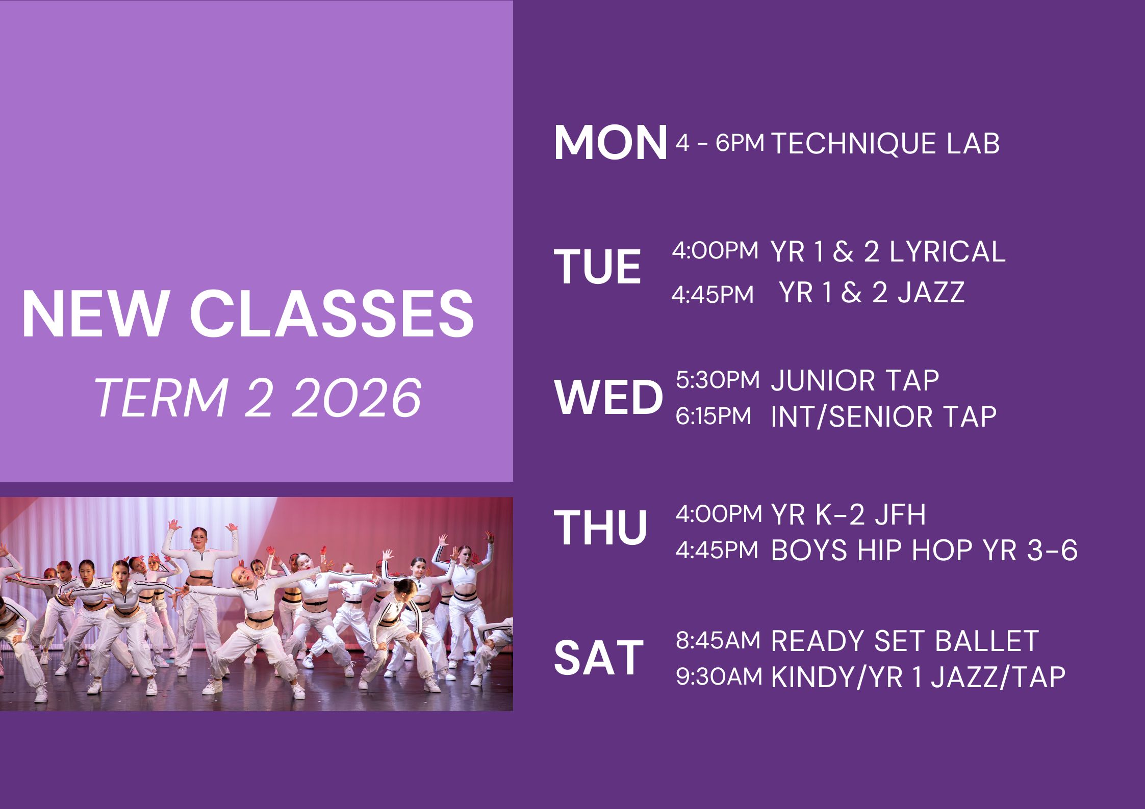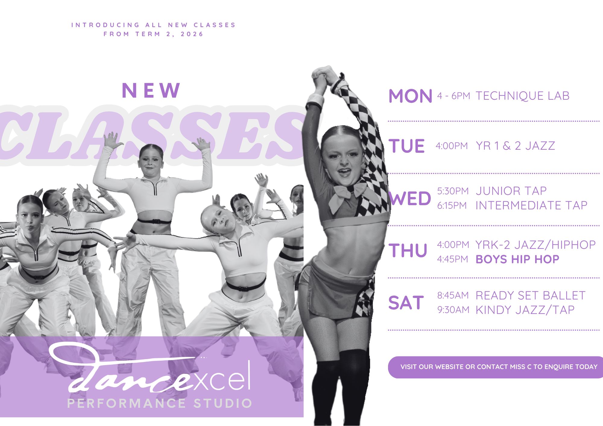 Mini Movers, Jazz, Hip Hop, Classical Ballet, Lyrical, Contemporary, Musical Theatre & Acro.